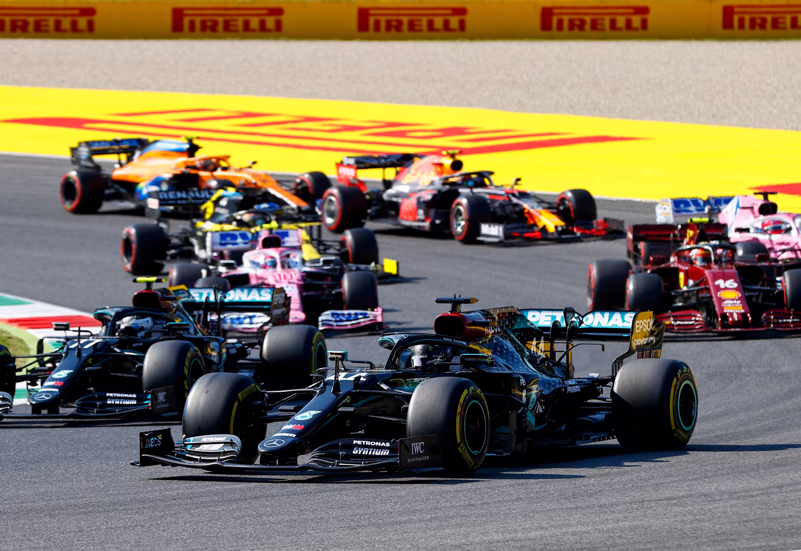 Lewis Hamilton e Valtteri Bottas, entrambi su Mercedes F1 W11 EQ Performance, si danno battaglia alla ripartenza.